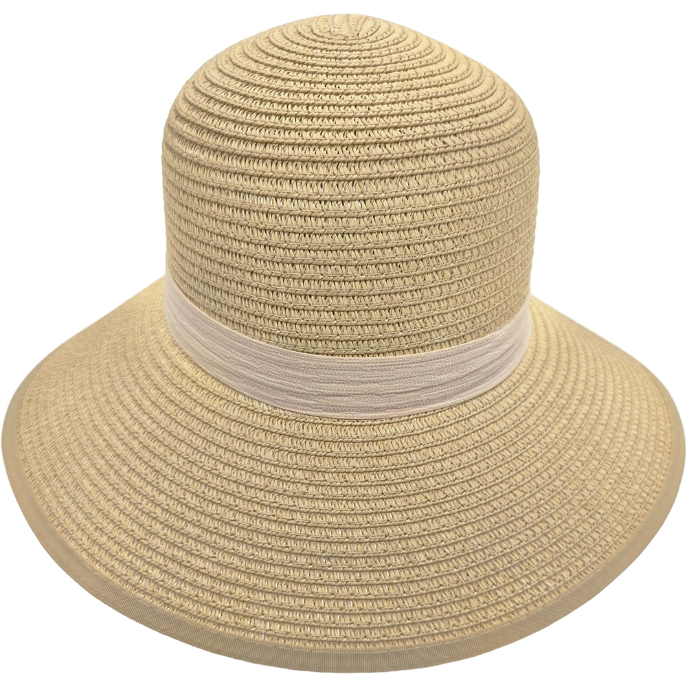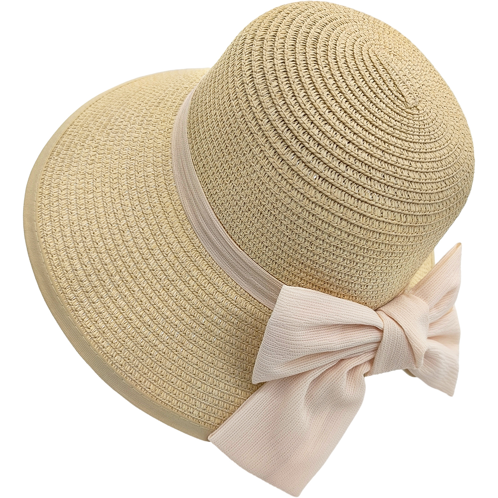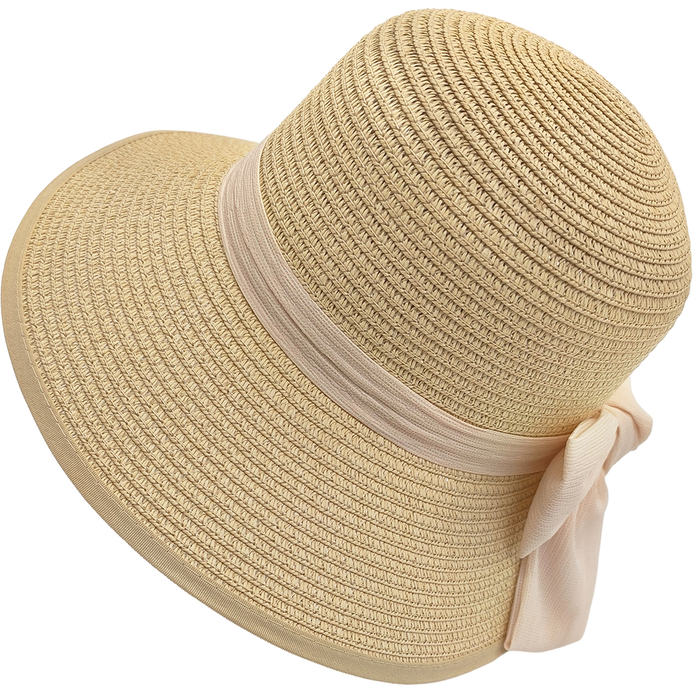 Καπέλο Γυναικείο Ψάθινο, Κώνος Με Γείσο & Κορδέλα Με Ροζ Φιόγκο Στο Πίσω Μέρος – Μπεζ Ανοιχτό